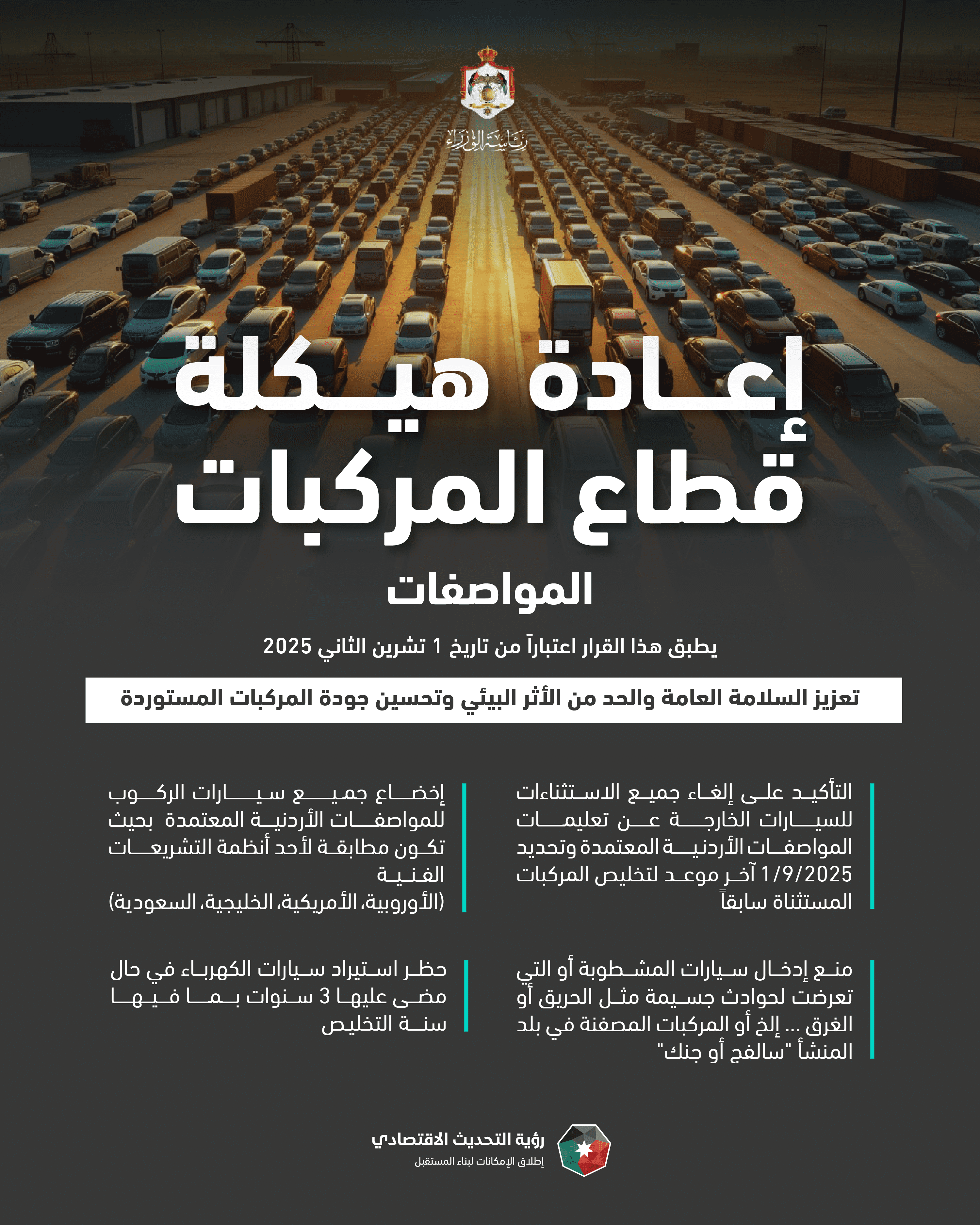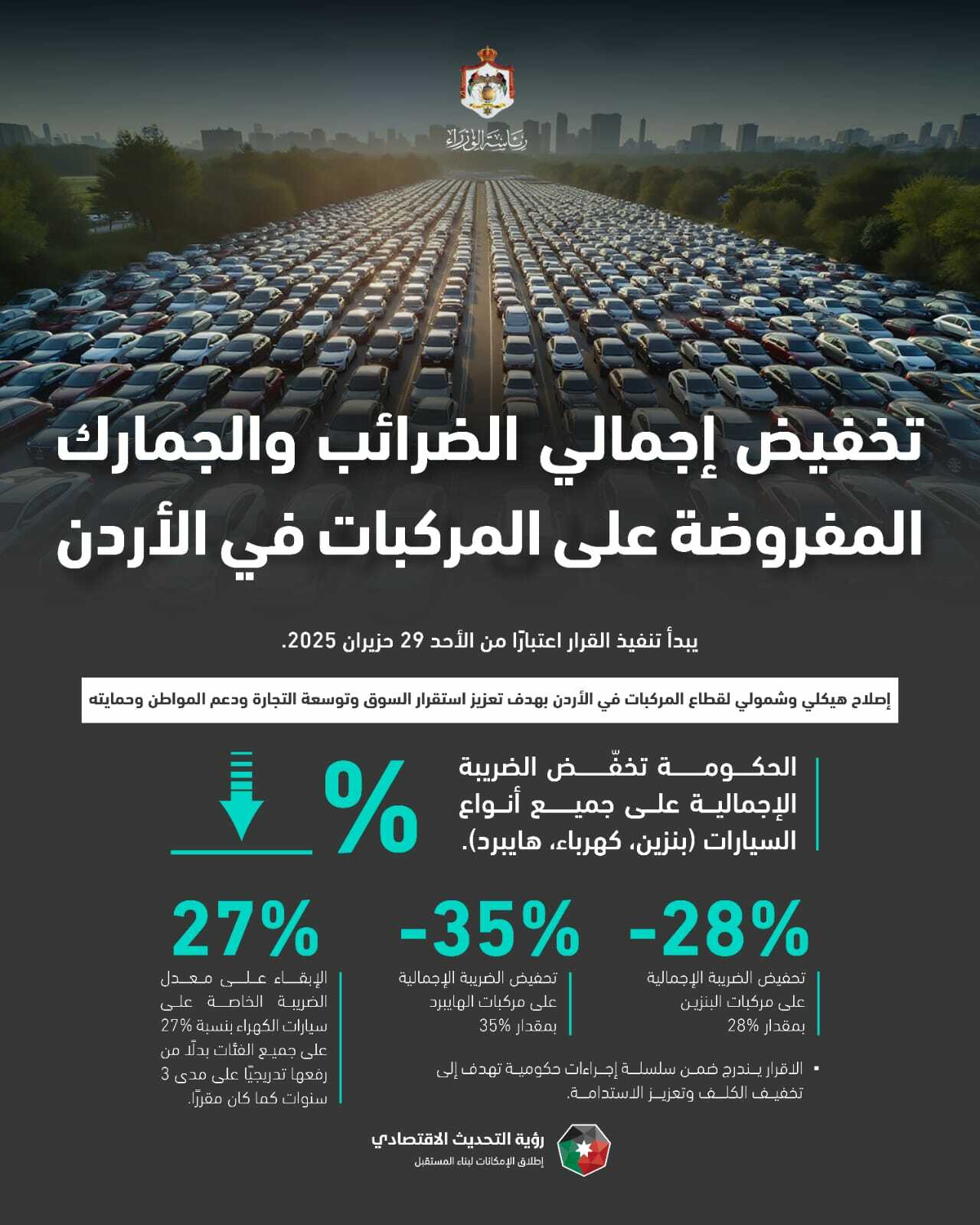 الحكومة تخفّض الضريبة الإجمالية (العامّة والخاصة) على المركبات ضمن حزمة إصلاح هيكلي وشمولي تسهم بشكلٍ كبير في تخفيف الكلف على المواطنين