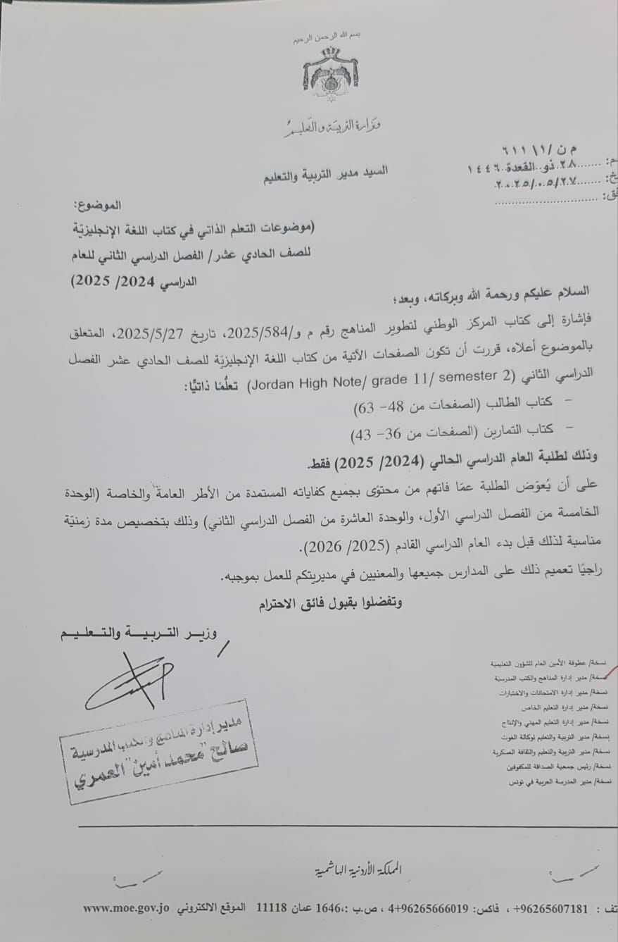 قرار بحذف الوحدة العاشرة من كتاب اللغة الإنجليزية الصف الحادي عشر الفصل الثاني