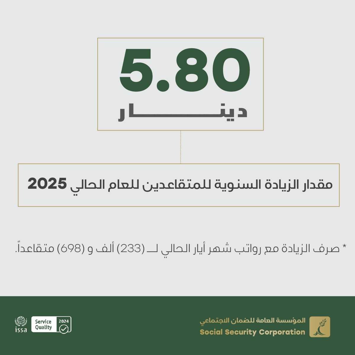 الضمان الاجتماعي: خمسة دنانير وثمانون قرشاً مقدار الزيادة السنوية للمتقاعدين