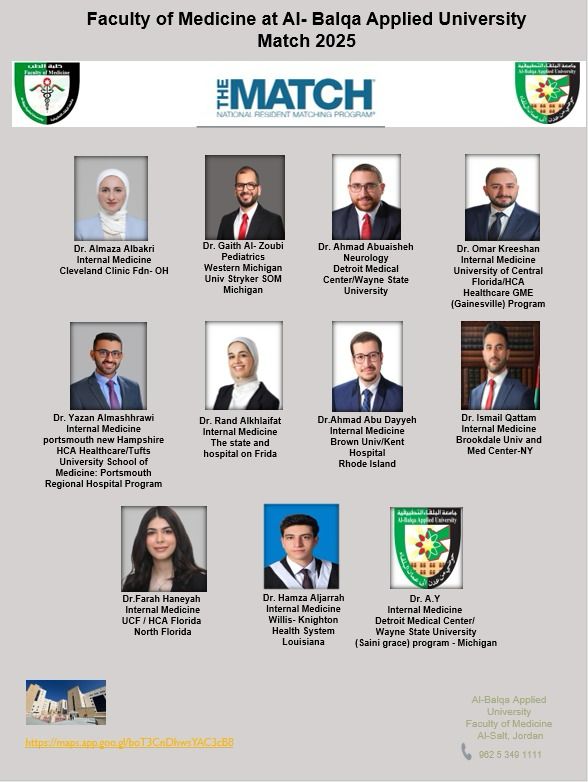 11 طبيبًا من خريجي كلية الطب في “البلقاء التطبيقية” يحصلون على قبولات تدريب سريري في برامج الإقامة الأمريكية