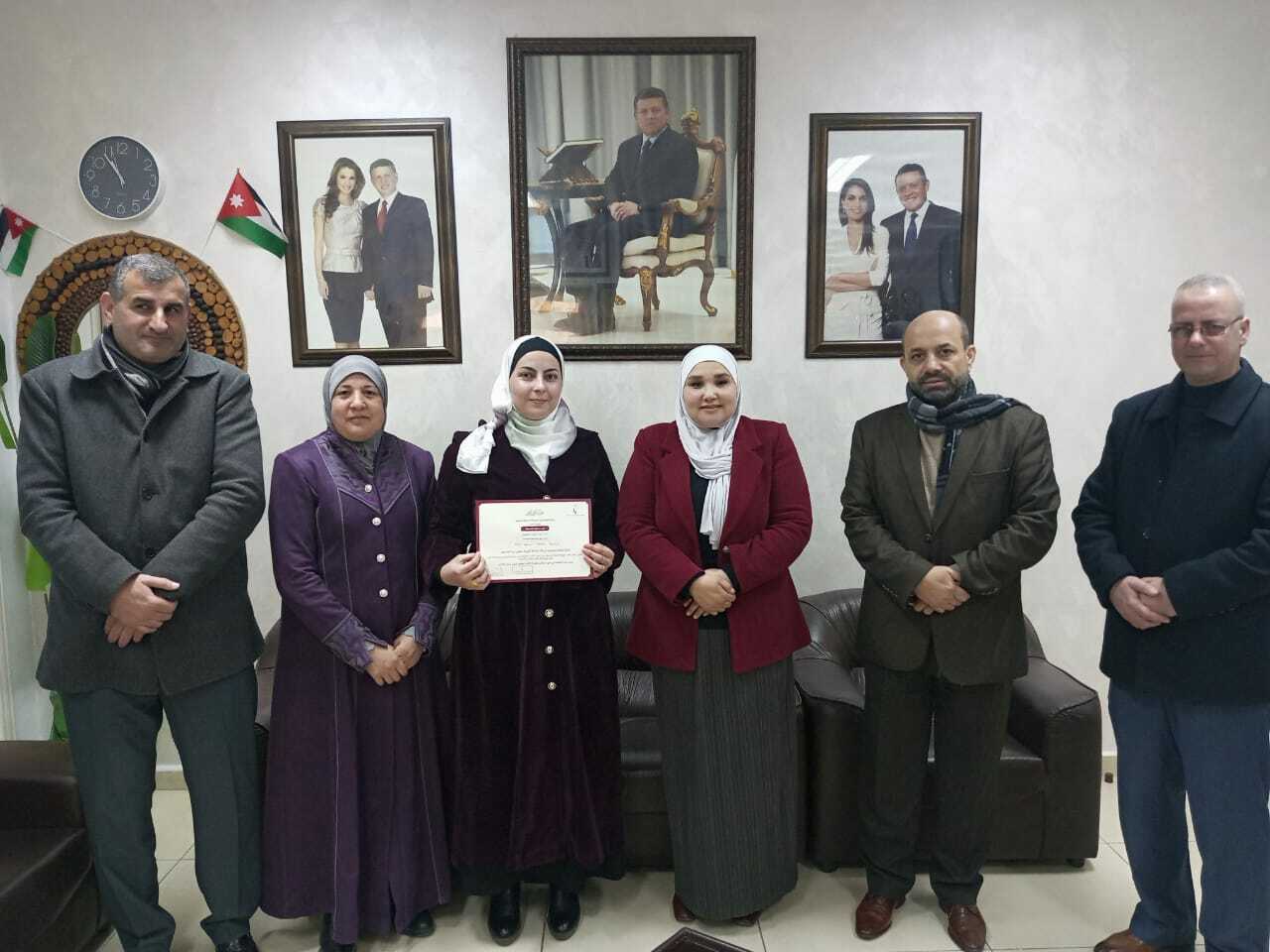 البكار تكرم المعلمة الحاصلة على شهادة تقدير من جائزة الملكة رانيا للتميز التربوي