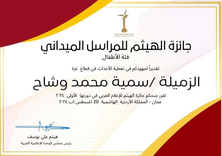 الطفلتان الغزيتان سمية ولمى تفوزان بجائزة الهيثم للمراسل الميداني فئة الأطفال