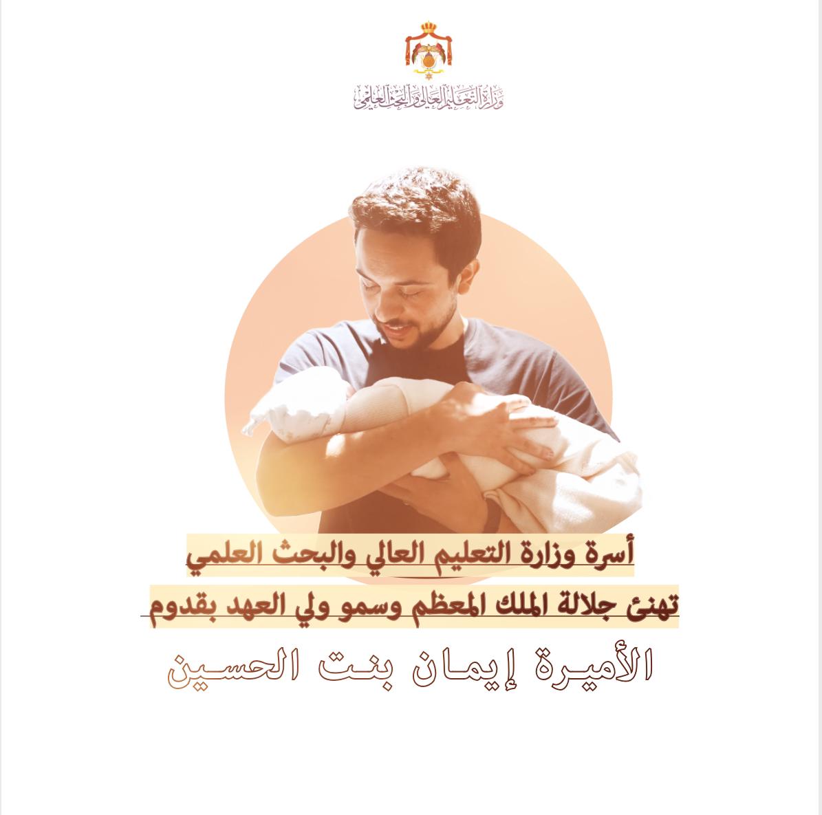 أسرة وزارة التعليم العالي والبحث العلمي تهنئ بقدوم سمو الأميرة إيمان بنت الحسين