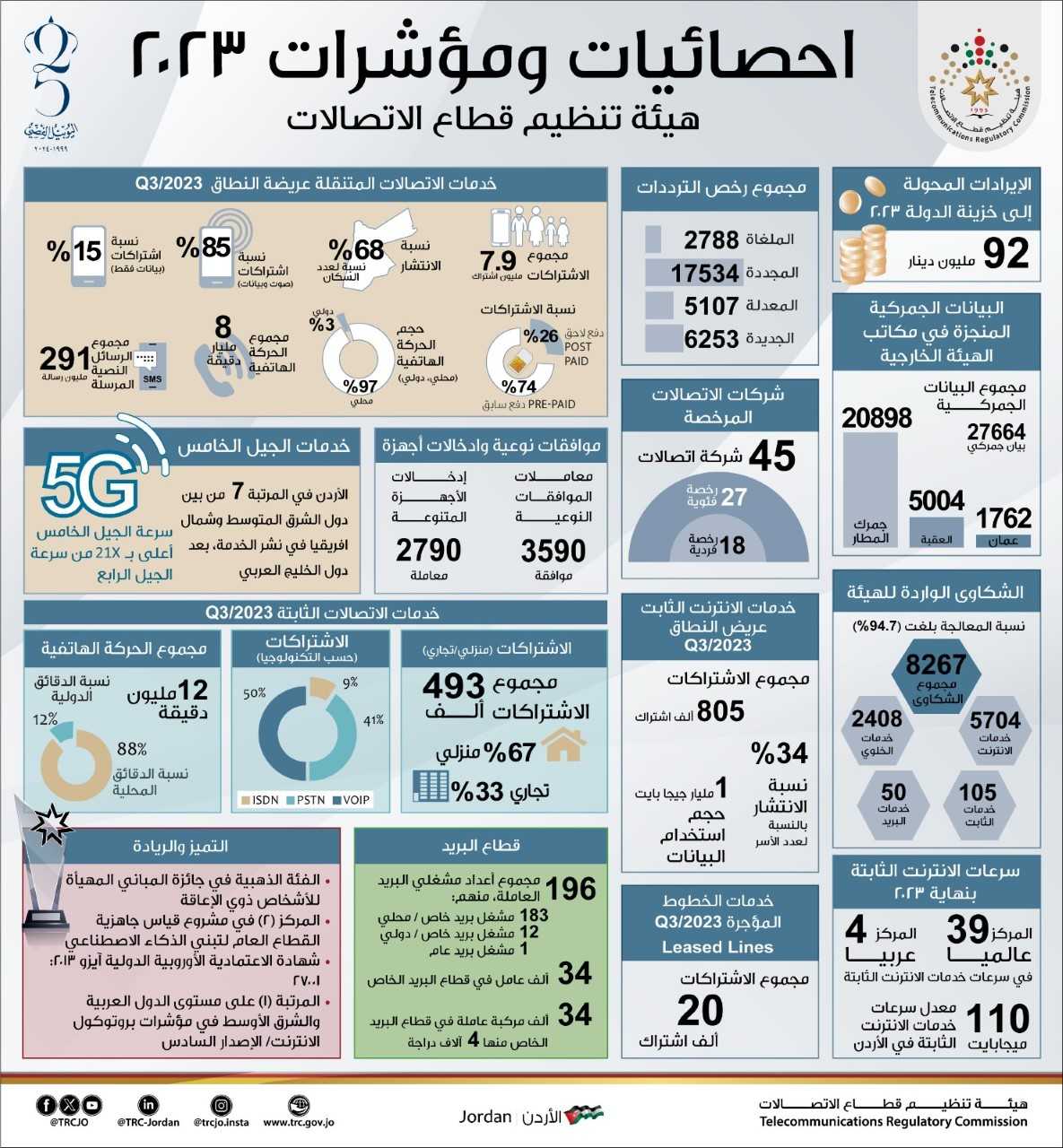 تنظيم الاتصالات: 92 مليون دينار الإيرادات المحولة إلى خزينة الدولة العام الماضي