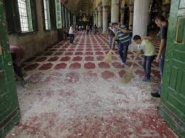 متطوعون ينظفون آثار اعتداء الاحتلال على الأقصى(فيديو)