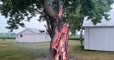 كأنه مشهد سينمائى.. شجرة تحترق من الداخل بعدما ضربتها صاعقة برق "صور"