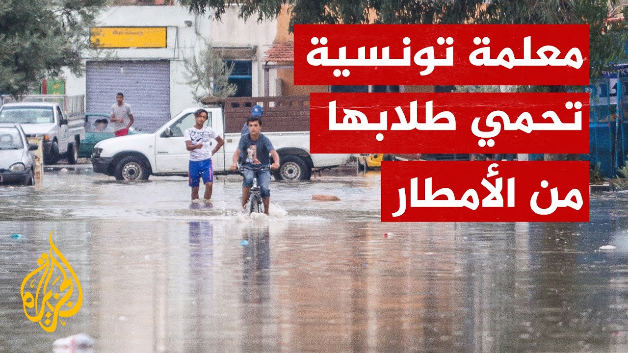 معلمة في تونس تحمل تلاميذها على ظهرها لإبعادهم عن مياه الأمطار